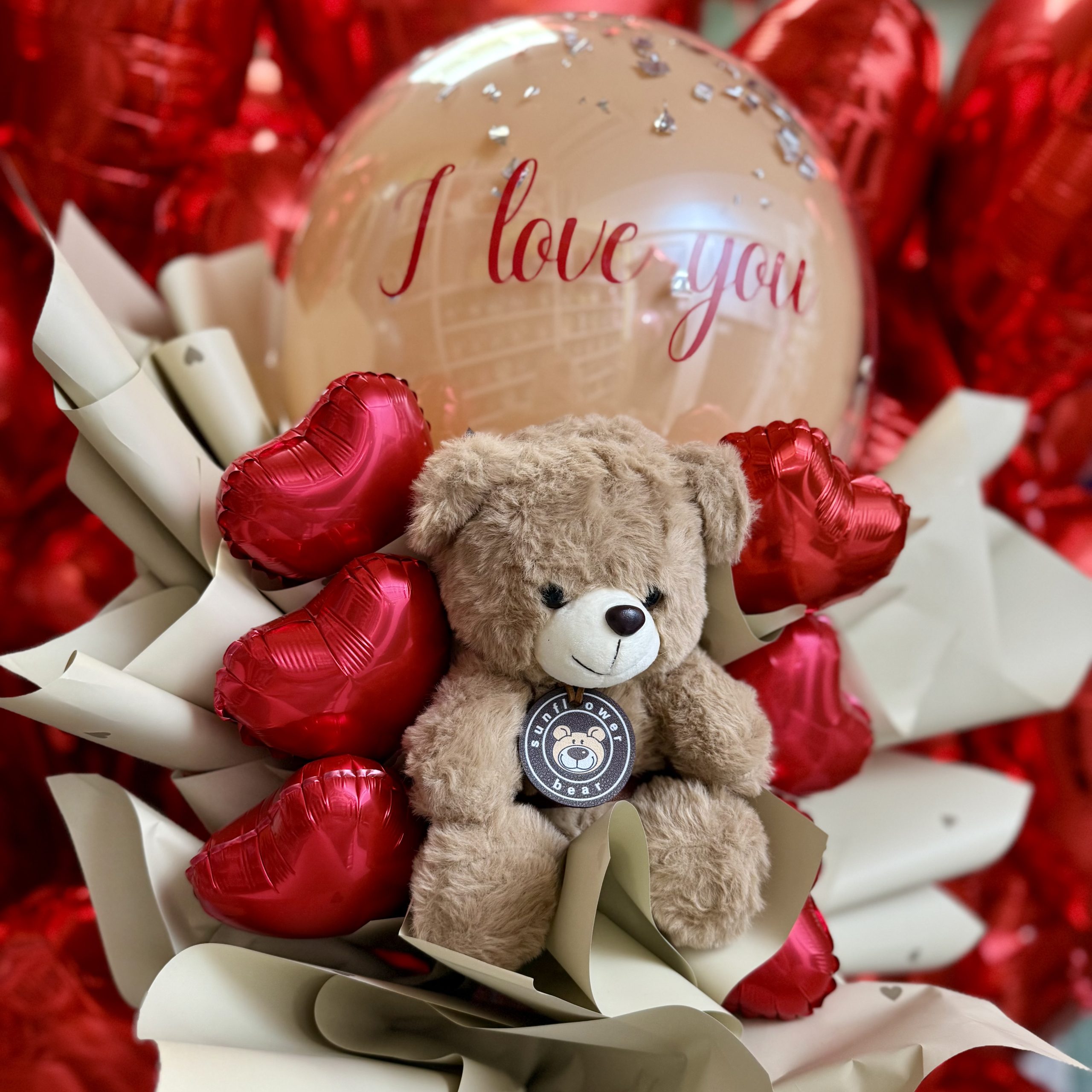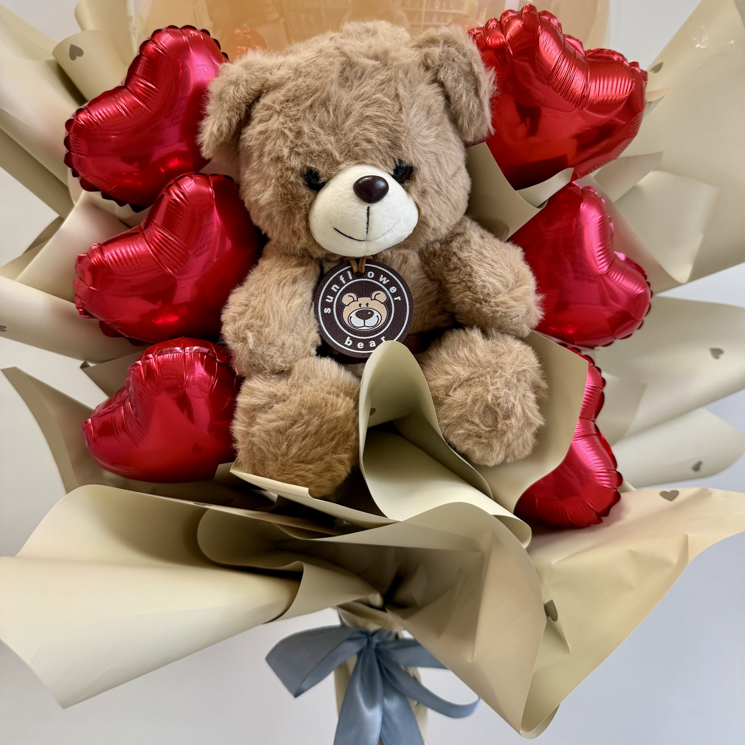 NaÅ”i balon buketi izrađeni su od dekor papira, kombinovani s malim balonima u obliku srca, maÅ”nama i mogu biti sa slatkim pliÅ”anim medama.